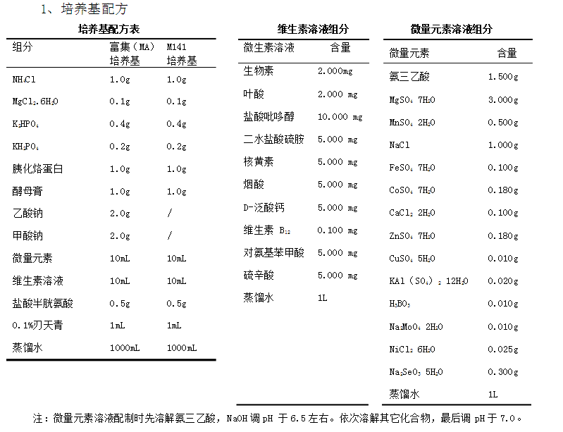 NH4Cl、MgCl2·6H2O、K2HPO4、KH2PO4、甲酸鈉、乙酸鈉、胰化酪蛋白、酵母膏、鹽酸半胱氨酸、刃天青、Na2S·9H2O、NaHCO3、氨三乙酸、MgSO4·7H2O、MnSO4·2H2O、NaCl、FeSO4·7H2O、CoSO4·7H2O、CaCl2·2H2O、ZnSO4·7H2O、KAl(SO4)2·12H2O、CuSO4·5H2O、H3BO3、Na2MoO4·2H2O、NiCl2·6H2O、Na2SeO3·5H2O、生物素、葉酸、鹽酸吡哆醇、二水鹽酸硫胺、核黃素、煙酸、D-泛酸鈣、維生素B12、對氨基苯甲酸、硫辛酸。
