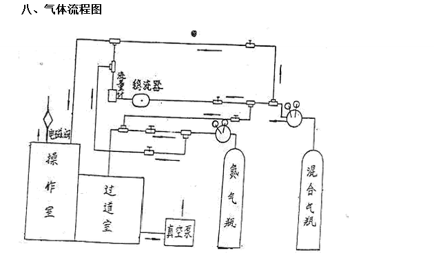 6.操作室第二次置換(氮氣置換)重復一次充氮過程,并注意隨時用腳踏開關開閉排氣。 7.操作室第三次置換(混合氣體置換)。