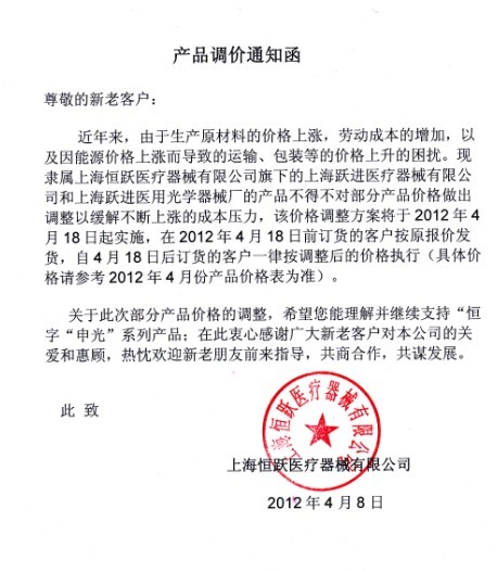 上海躍進產品調價通知
